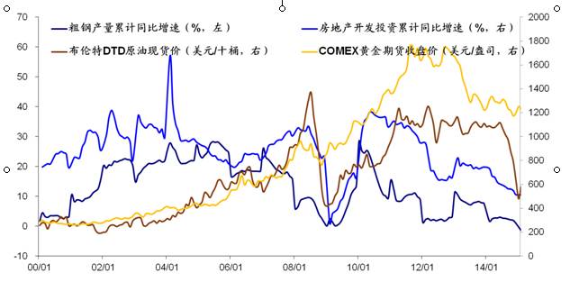 图1 粗钢、房地产、原油及黄金走势