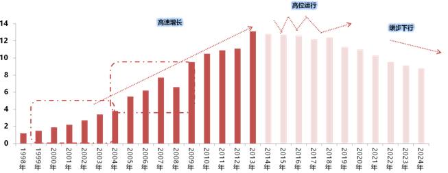 随着数量增长型人口红利结束,老龄化趋势加快,房地产刚需已经达到高点,2015年房地产投资增速只有1%,说明开发商对前景不乐观,改变了过去15年该行业投资一路向上的格局;市场阶段性顶部预计成交面积在13亿平米,2013年已达到,成交金额在9万亿元左右。未来5年预计会进入平稳期,维持高位运行,到2020年前后成交量将开始缓步下行。