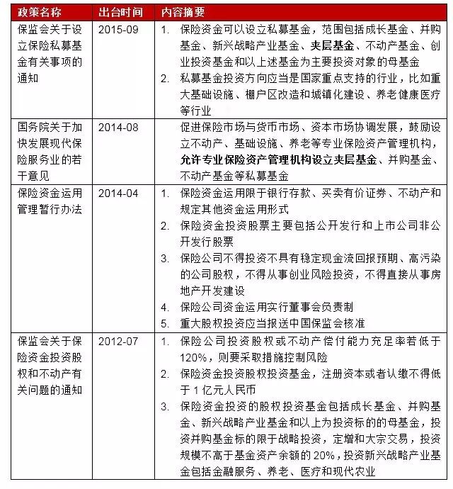 虽然有很多地方有待完善,但夹层基金仍旧是一个具有投资潜力的领域。由于房地产业融资渠道有限、国内基建投资需求旺盛、并购贷款制度不完善等因素的作用,国内投资机构对夹层基金在地产、基建和并购领域运作的前景持续看好。按照保监会2014年《关于加强和改进保险资金运用比例监管的通知》,保险资金运用于权益类资产投资比重不得超过30%,理论上目前保险资金投资夹层基金的上限可达到38486亿元。根据2014年的《国务院关于加快发展现代保险服务业的若干意见》(简写为《国十条》,下文同)中第十四条明确指出:"允许专业保险资产管理机构设立夹层基金。并购基金、不动产基金等私募基金"。这一意见的出台加快了保险资金投资夹层基金的步伐。除《国十条》外,目前保险领域和夹层基金相关政策参见下表: