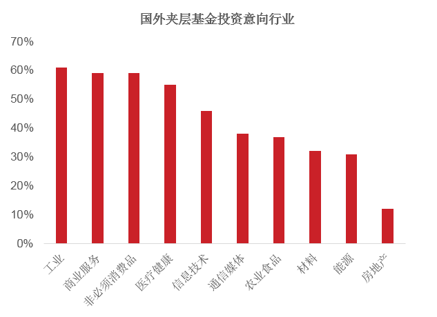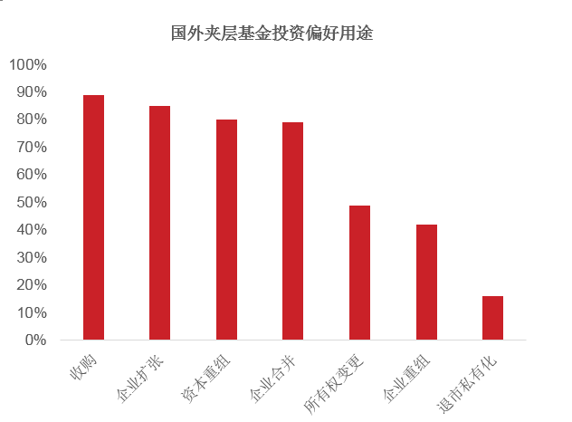 投资方面,海外夹层基金投资偏好于传统行业,据统计,61%的夹层基金投资于工业,其次是商业和服务业、医疗健康产业。能源和房地产业是投资较少的领域,仅有不到30%的夹层基金对能源业和房地产业具有偏好。从投资的目的上分析,接近90%的夹层基金关注于企业收购领域,接下来是企业扩张和企业合并,选择作为退市私有化用途的夹层基金仅有16%。行业和投资目的的两项数据表明,海外夹层基金依旧着力于传统行业的产能扩张和资本重组,这和夹层基金最初的投资用途——为杠杆收购提供资金具有内在的一致性。从投资的回报和风险维度衡量,夹层基金和直接贷款、母基金的风险收益水平相当,在收益上低于次级贷款和私募基金,是一种收益稳健的投资工具。