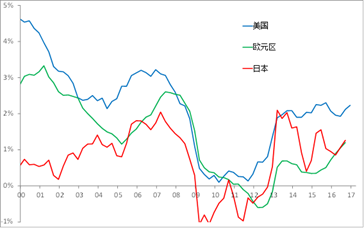 2017年,欧美日经济均处于复苏之中,这对中国借助外需是有利的。其中,美国的情形相对最好,2010年以来一直保持同比正增长;而欧元区在2011-2013年曾经历衰退;日本则几经反复,最近的这次持续正增长始于2015年。IMF预测欧元区、日本今年的GDP增速分别是1.6%、0.8%,与去年的1.7%、0.9%增速大致相当。