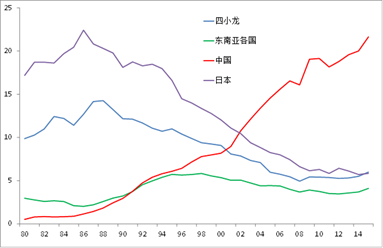 中国、日本、四小龙、东南亚各国的美国进口份额
