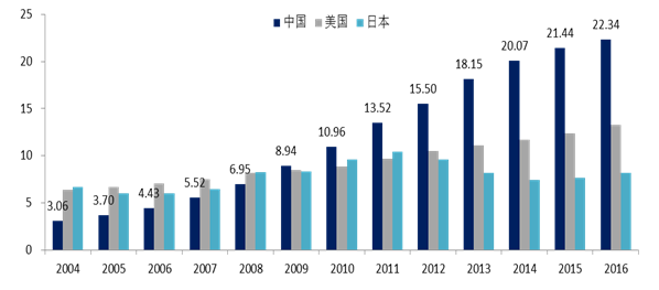 国内长期以来投资增速非常高,最终导致的结果就是货币的膨胀。中国的货币创造经历了引进外资、出口导向、“商业银行+企业”三个阶段。截至2016年末,中国M2总量为22.34万亿美元,超过美国和日本的13.28万亿美元、8.19万亿美元之和。