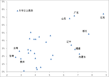 纵轴:新增大专以上学历人口在全国的占比 横轴:人均GDP