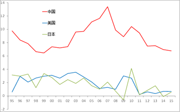 美国、欧元区与日本的GDP增长率