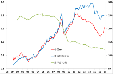 当前社会普遍对通胀预期较高,我们对通胀的预测需要从价格形成体系和传导机制入手进行分析。下图表明中美PPI之间的裂口是在2012年发生的,之前它的波动非常一致,裂口出现的原因就是中国出现了产能过剩和需求下降。